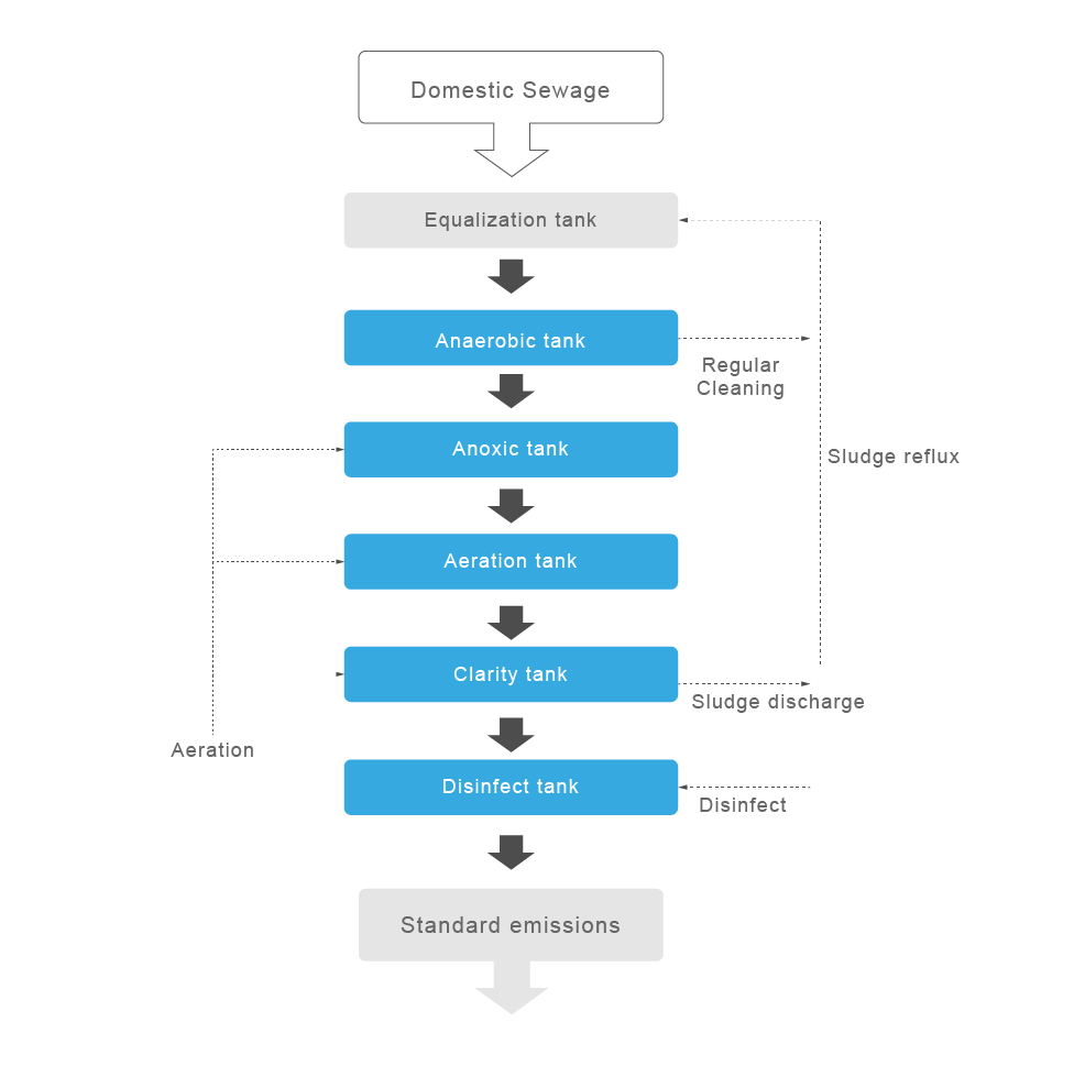 يستخدم النظام تقنيات حديثة تجمع بين عمليات التخمر اللاهوائي-اللاأكسجيني-الأكسجيني (AAO) وتقنية مفاعل الأغشية الحيوية المتحركة (MBBR). يضمن هذا المزيج الفعال إزالة الملوثات العضوية والمغذيات بكفاءة عالية. ونتيجة لذلك، يظل السائل المعالج متوافقًا باستمرار مع معايير التصريف الصارمة، مما يحمي البيئة المحلية. تضمن هذه العملية البيولوجية المتقدمة أداءً موثوقًا للنظام حتى في ظل ظروف الأحمال المتغيرة الشائعة في أماكن الإقامة الريفية والمواقع السياحية.
