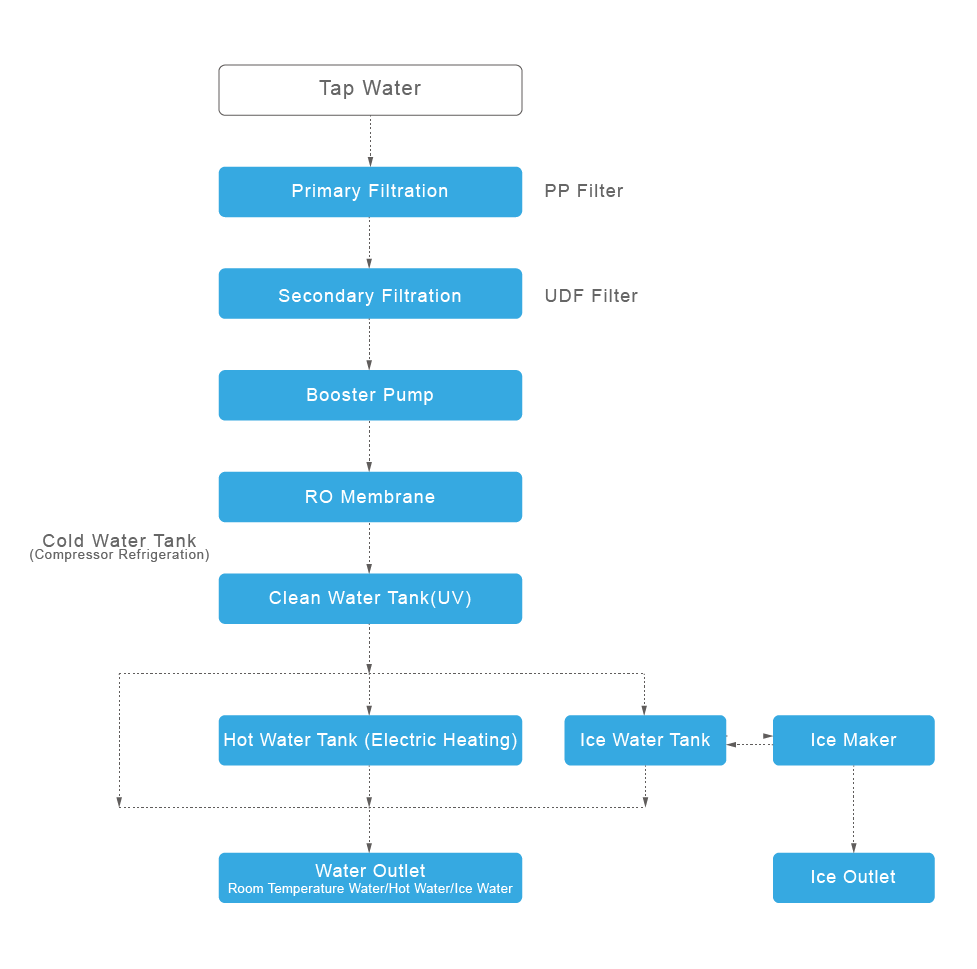 يستخدم موزع المياه العمودي هذا نظام ترشيح ثنائي المراحل، حيث توفر كل مرحلة مستوىً مختلفًا من التنقية. وهو مزود أيضًا بوحدة غشاء التناضح العكسي، تعمل معًا على ترشيح المياه عبر طبقات متعددة، لتحويلها في النهاية إلى مياه آمنة وجاهزة للشرب. يوفر الجهاز إمكانية تخصيص درجة حرارة المياه حسب الطلب، سواء كانت ساخنة أو باردة أو بدرجة حرارة الغرفة. بالإضافة إلى ذلك، يتميز بخيار مزدوج الوظائف لصنع الثلج أو إنتاج المياه الغازية، مما يوفر خيارات متعددة.