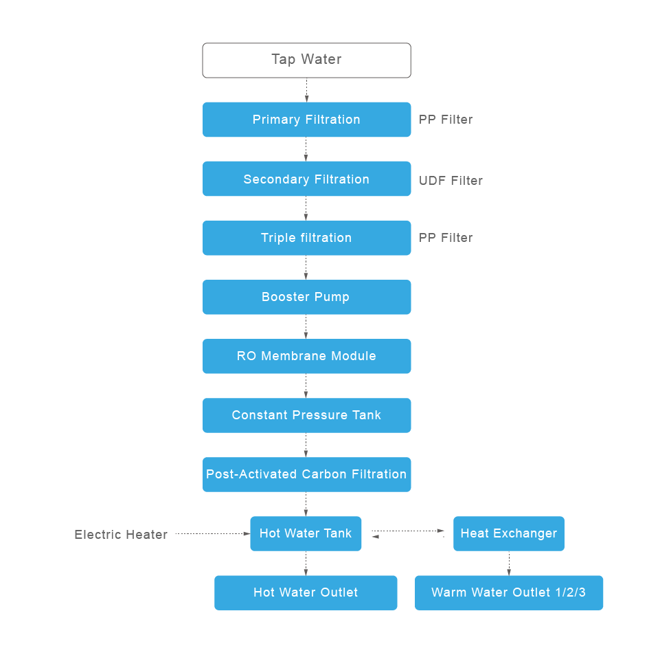 يستخدم موزع المياه هذا، الذي يوضع على سطح الطاولة، نظام ترشيح ثلاثي المراحل، حيث صُممت كل مرحلة لمستوى تنقية محدد. وبفضل وحدة غشاء التناضح العكسي، يقوم الجهاز بتصفية الشوائب تدريجيًا عبر طبقات متعددة، ليُوفر مياه شرب نظيفة وآمنة جاهزة للاستخدام. كما يُتيح الجهاز إمكانية اختيار درجة حرارة الماء (ساخن، بارد، أو بدرجة حرارة الغرفة) حسب الطلب. وهو مُجهز أيضًا بصنابير متعددة، مما يضمن تدفقًا عاليًا للمياه لتلبية احتياجات الاستخدام المختلفة بكفاءة.