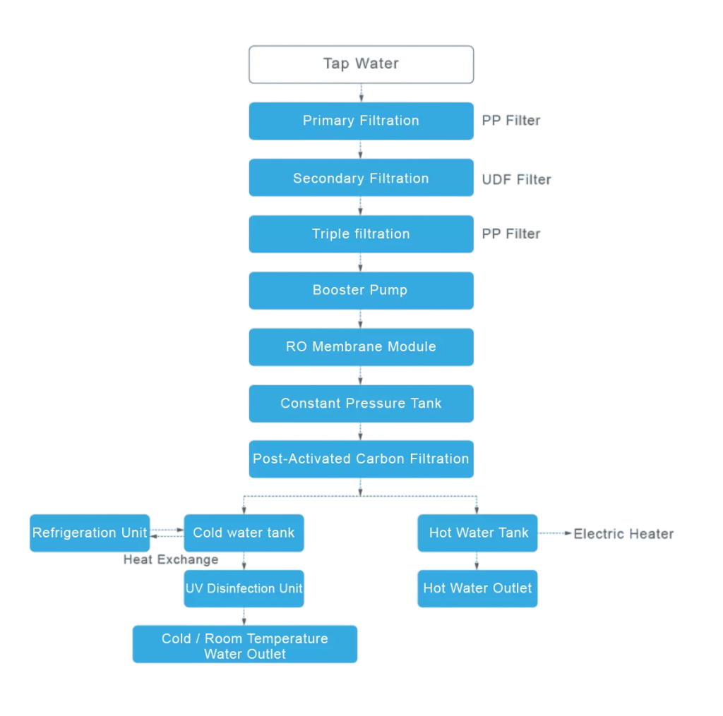 يتميز موزع المياه العمودي هذا بنظام ترشيح ثلاثي المراحل، حيث تعمل كل مرحلة على ترشيح الشوائب بمستوى مختلف. كما أنه مزود بوحدة غشاء التناضح العكسي لمزيد من التنقية. من خلال عملية الترشيح متعددة الطبقات هذه، تتحول مياه الصنبور إلى مياه شرب نظيفة وآمنة. يوفر الجهاز سهولة الحصول على مياه ساخنة أو باردة أو بدرجة حرارة الغرفة حسب الحاجة.