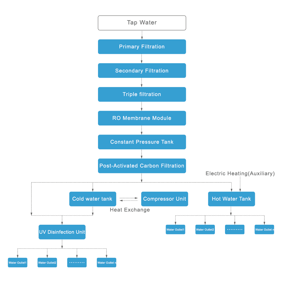 يستخدم موزع المياه الخارجي هذا نظام ترشيح ثلاثي المراحل، حيث توفر كل مرحلة مستوىً مختلفًا من التنقية. ويُعزز هذا النظام بوحدة غشاء التناضح العكسي، التي تعمل معًا لترشيح المياه عبر طبقات متعددة. تحوّل هذه العملية مصادر المياه المتاحة إلى مياه آمنة وجاهزة للشرب. صُمم الموزع لسهولة الوصول إليه من قِبل العامة، حيث يسمح بجمع المياه من جميع الجهات الأربع. كما يوفر الجهاز مرونة في توزيع المياه الساخنة أو الباردة أو بدرجة حرارة الغرفة حسب الحاجة.